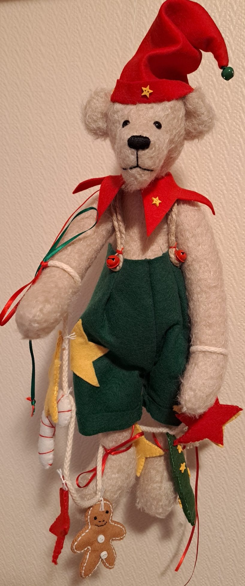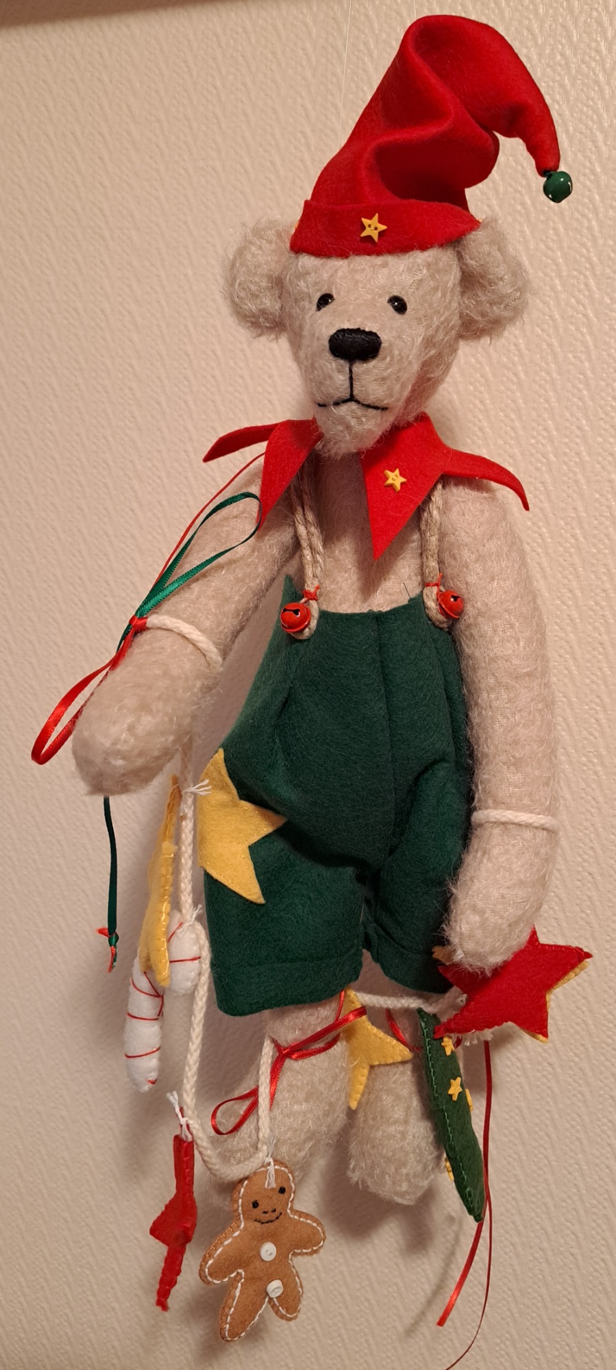 Een prachtige kerstbeer, genaamd Juul, gemaakt van wollen sparse mohair van de Steiff-Schulte weverij. Een wollen stof die nauwelijks verslijt. Gevuld met zuivere wol. Tegenstof voetjes van wollen vilt. Patroon en materiaal komt van berenatelier Tierlantijntje. De kleding van de beer is van wollen vilt. Zeer gedetailleerd. Het is eigenlijk een collector item....